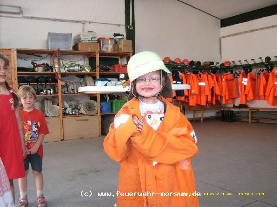 | Besuch vom Morsumer Kindergarten am 14.06.2006 von 10:00 - 11:30 Uhr | Bei herrlichem Sommerwetter besuchten uns die Morsumer Kindergartenkinder. In zwei Gruppen aufgeteilt, waren sie zu Fuß mit ihren Erzieherinnen zum Feuerwehrgerätehaus gekommen. Ortsbrandmeister Uwe Brück stand den Fragen der wissbegierigen Kinder Rede und Antwort. „Wo ist denn die Stange an der die Feuerwehrleute nach unten rutschen“? oder "wie kommt das Wasser zum Strahlrohr" waren zum Beispiel Fragen die die Kinder beantwortet haben wollten.