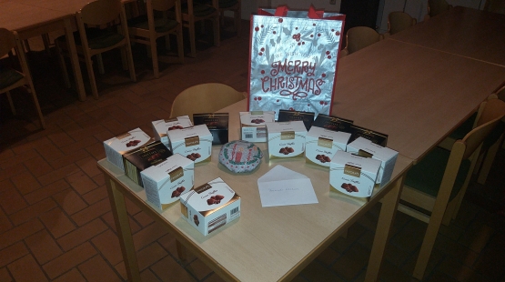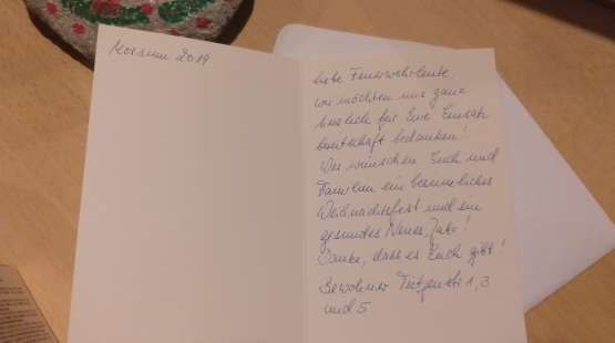 Heute Abend wurden wir auch vom Weihnachtsmann besucht. Die lieben Nachbarn der Tietjenstraße 1,3,5 beschenkten uns mit leckeren Süßgebäck, einen schönen selbst bemalten Stein und ein paar netten Grußworten.