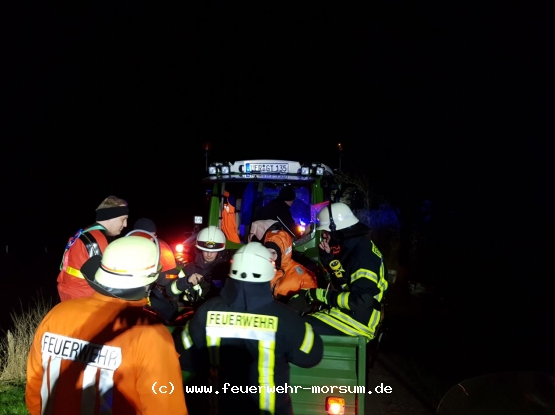 Mit Hilfe des Trecker vom Bauhof, dem DRK und einem Kameraden in Überlebensanzug, konnte der Mann an Bord geholt werden und an den Rettungsdienst übergeben werden. Das Auto blieb zurück, da die Pegel fallend waren.