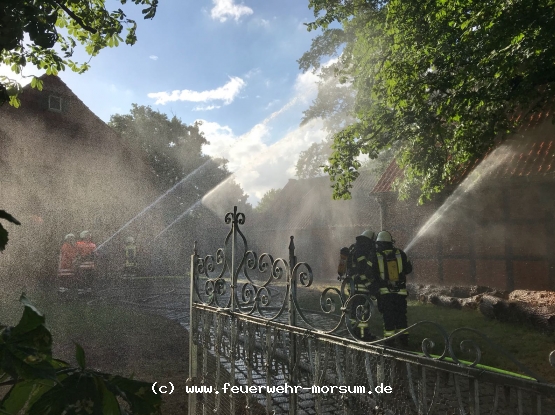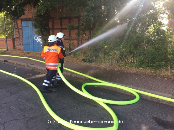 | Gegen 18:52 Uhr wurden wir von der Rettungsleitstelle zu einer Rauchentwicklung in die Morsumer Schulstraße alarmiert. Das Einsatzobjekt war ein Pferdestall in dem eine vermisste Person liegen sollte. Die Atemschutzgeräteträger durchsuchten das verqualmte Gebäude, während die übrigen Kameraden mit der Wasserförderung und der Absicherung der Einsatzstelle beschäftigt waren.