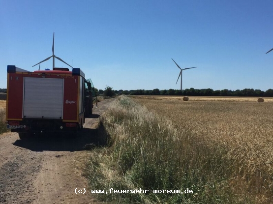 | Am Sonntagnachmittag wurden wir gegen 15:00 Uhr erneut zu einem Flächenbrand 3 nach Beppen alarmiert. Hier stand ein weiterer Teil einer landwirtschaftlichen Fläche in Brand. Aus bislang ungeklärter Ursache kam es erneut zu einem großflächigen Brand von mehr als 20 Hektar Ackerfläche. Der Flächenbrand hatte sich rasend schnell, angetrieben von starkem Wind, auf zwei Felder ausgebreitet. Die Qualmwolke war mehrere Kilometer weit zu sehen. Mit Wasser und sogenannten Feuerpatschen wurde das Feuer bekämpft. Auch diesmal entstand am eingesetzten Mähdrescher kein größerer Schaden.