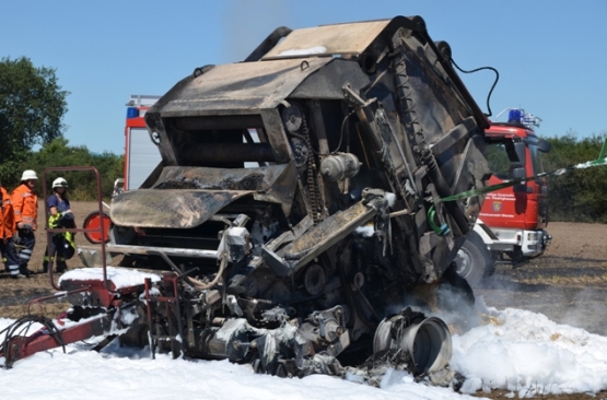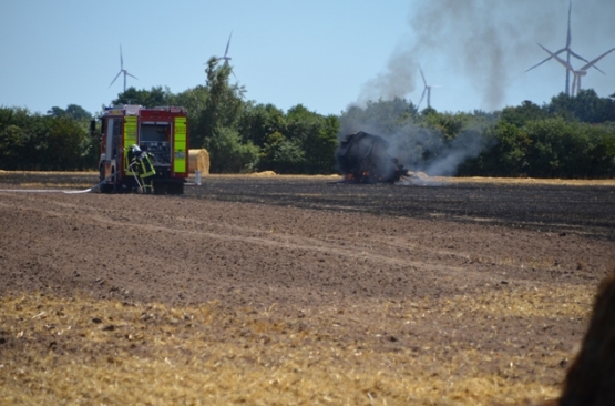 | Die Serie reißt nicht ab. Zur Mittagszeit wurden wir erneut zu einem Flächenbrand 2 nach Beppen alarmiert. Hier fing eine Rundballenpresse Feuer. Bedingt durch die weiter anhaltende Trockenheit entstand rasch ein Flächenbrand. Auch heute waren wieder mehrere Feuerwehren Landkreisübergreifend im Einsatz, damit die nötigen Tanklöschfahrzeuge zur Brandbekämpfung zur Verfügung standen. Erstmals kamen auch drei mit Wasser befüllte Tanklastwagen eines Lohnunternehmers zum Einsatz, um schnell das nötige Löschwasser an die Einsatzstelle zu bekommen.