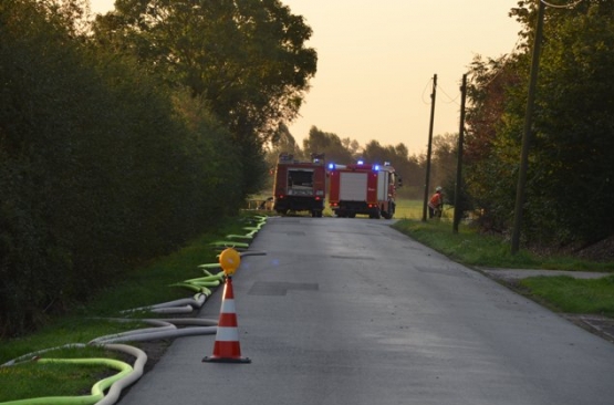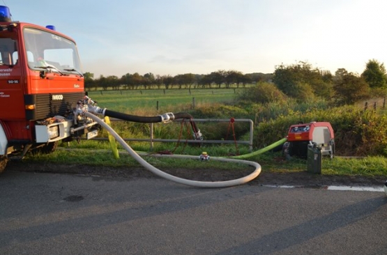Für die Wasserversorgung haben wir aus der alten Eiter mit der Frontpumpe unseres LF16-TS, sowie die tragbare Feuerwehrpumpe aus unserem TSF-W Wasser entnommen und mit zwei B-Schlauch-Leitungen in das LF20 Thedinghausen gepumpt. Die B-Leitungen waren jeweils ca.300 m lang.