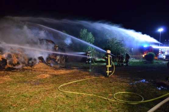 Da die „modernen“ Rundballen mit hohem Druck gebunden werden, kann das Löschwasser nur sehr schlecht in die Ballen eindringen, das Feuer aber sehr gut. Damit diese aber gelöscht werden können, müssen die Ballen auseinander gezogen werden. Dieses haben wir mit ein Trecker eines Lohnunternehmers aus der Samtgemeinde gemacht.