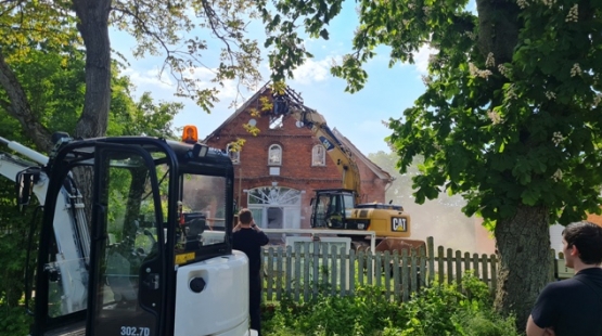 Da schon die Dachbalken stellenweise durchgebrannt und die Zwischendecke beschädigt waren, wurde zur Sicherheit früh der Innenangriff eingestellt. Mit Hilfe von zwei Drehleitern sollten der Brand von außen weiter bekämpft werden. Jedoch konnten so diverse Glutnester nicht erreicht werden. Um den Einsatz abschließend abarbeiten zu können, wurde es nötigt das Gebäude gezielt einzureißen und auf einer anliegenden Wiese abzulöschen.