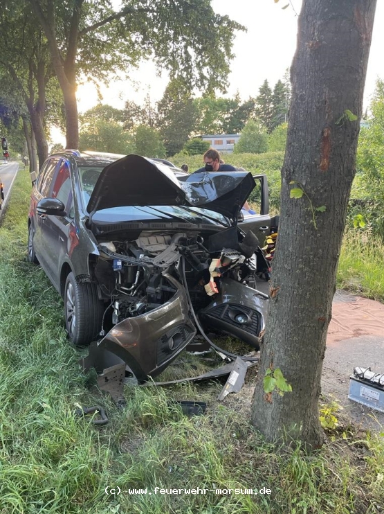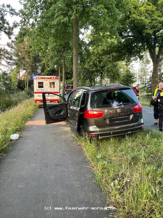 Mit dem heutigem Alarmstichwort „T1 VU, PKW gegen Baum, Verdener Straße“ wurden wir alarmiert. Mit beiden Fahrzeugen rückten wir Richtung Lunsen aus. Zwischen der Härsenstraße und dem Gewerbegebiet Morsum trafen wir auf die Einsatzstelle. Ein PKW ist aus Lunsen kommend über die Gegenspur gegen einen Baum gefahren. Der Fahrer hatte hierbei besonders Glück. Direkt hinter ihm führ ein Streifenwagen und ein Feuerwehrkamerad aus Thedinghausen kam aus Morsum entgegen. Während der Kamerad sofort Erste-Hilfe leistete, konnte die Streifenwagenbesatzung die Unfallstelle absichern. Der Rettungswagen, der in Morsum stationiert ist, konnte die weiteren medizinische Versorgung übernehmen. Der Fahrer des Fahrzeugs wurde zur Sicherheit in ein Krankenhaus gefahren. Die Einsatzstelle musste zur Rettung des Fahrers und der Unfallaufnahme halbseitig gesperrt werden. Da ein Schaden am Baum, sowie Öle und andere Flüssigkeiten ausgelaufen sind, mussten die Landesstraßenmeisterei und die Unterewasserbehörde alarmiert werden. Wir mussten die Flüssigkeiten abbinden und haben die Fahrzeugbatterie vom Bordnetz geklemmt. Für die Bergung des Fahrzeugs wurde die Straße für ca. 15 Minuten voll gesperrt. Wir konnten nach ca. einer Stunde wieder einrücken.