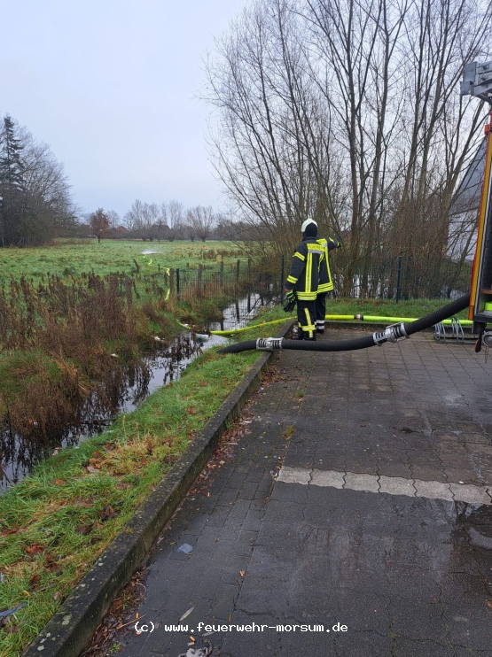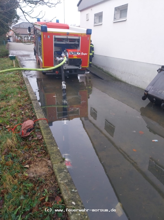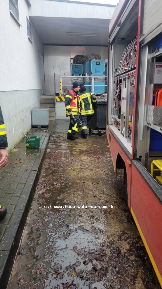 Sirenen um 8.12 Uhr. Wieder ein Hochwassereinsatz? Die Einsatzmeldung mit dem Stichwort T1 ließ darauf deuten. Weit gefehlt. Der hiesige Discounter konnte keine Waren entgegennehmen, da die Anlieferungsrampe komplett mit Wasser voll stand. Durch die anhaltenden Regenfälle der letzten Tage ist das Regenrückhaltebecken zum Markt so vollgelaufen, dass das Wasser von der Rampe nicht ablaufen konnte. Mit dem TSF-W und der eingeschobenen Pumpe wurde die Rampe geleert. Zeitgleich pumpte das TLF das Becken leer.