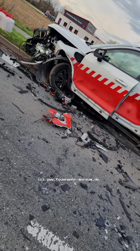 Auf dem Verdener Weg in Morsum, die Landesstraße zwischen Morsum und Lunsen, sind zwei Fahrzeuge frontal ineinander gefahren. Durch die Wucht des Aufpralles dreht sich der VW, blieb aber auf den Rädern stehen. Die Insassen beider Fahrzeuge profitierten von der Nähe der Rettungswache. Von dort wurde der erste Notruf abgesetzt und auch der erste Rettungswagen war so schnell vor Ort. Die Feuerwehr Thedinghausen (zeitgleich mit uns alarmiert) führten die technische Rettung durch, während wir die Einsatzstelle abgesichert haben. Die Kameraden aus Blender wurden zur Unterstützung der technischen Rettung hinzugezogen. Die Insassen wurden mit den Rettungswagen in Krankenhäuser gefahren.